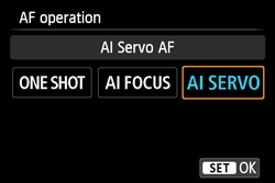 À l'opposé d'Af-S ou one shot, cette option permet de faire la mise au point sur des sujets en mouvement. Ce mode permet donc de photographier des sujets qui changeront de profondeur par rapport au photographe. Pour s'ajuster, l'appareil photo fait la mise au point à répétition très rapidement à partir du moment ou la détente est enclanchée. Cette option est très utile pour s'assurer que le sujet reste mis au point mais est limitée par le fait qu'il est probable que le photographe prenne une photo prendant que la caméra fait une nouvelle mise au point. Le sujet ne sera donc pas aussi net que si la photo avait été prise avec l'autre mode de mise au point.